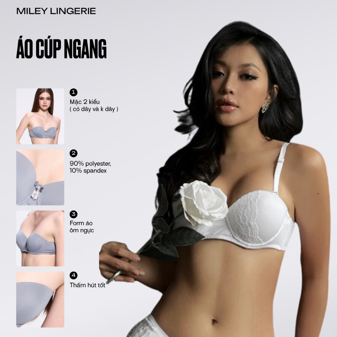 - Cúp ngực ngang vừa vặn ôm sát đường cong, cùng lớp mút vừa, mềm, chất liệu thun lạnh co giãn, thoáng khí giúp tôn dáng vòng một và không gây ngấn vòng lưng. Phần ngực thiết kế họa tiết ren làm điểm nhấn tạo nét nữ tính và nổi bật.