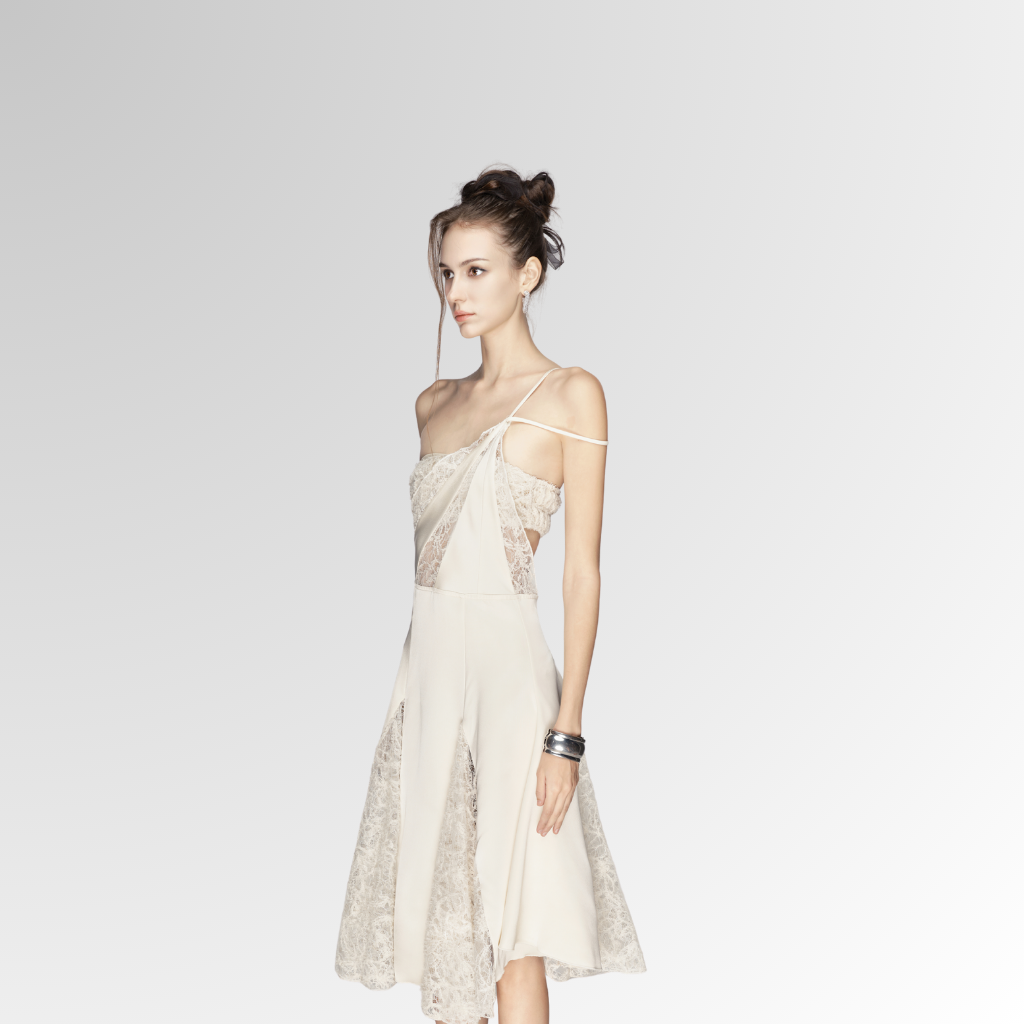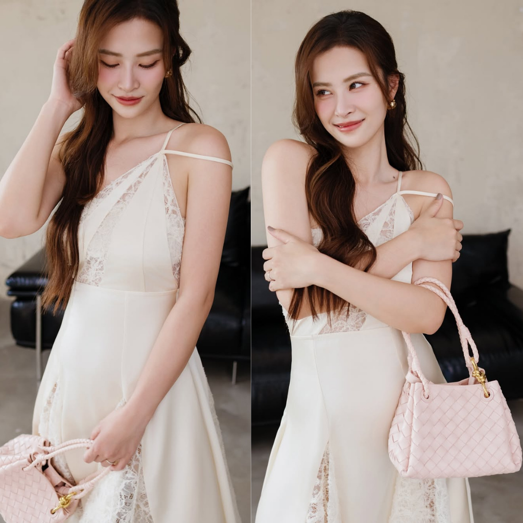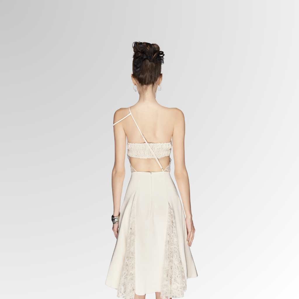 Đầm ren dáng A thanh lịch với thiết kế lệch vai độc đáo, phần chân váy xếp hai lớp mềm mại điểm xuyết chi tiết ren tinh tế, mang đến vẻ đẹp duyên dáng và cuốn hút.